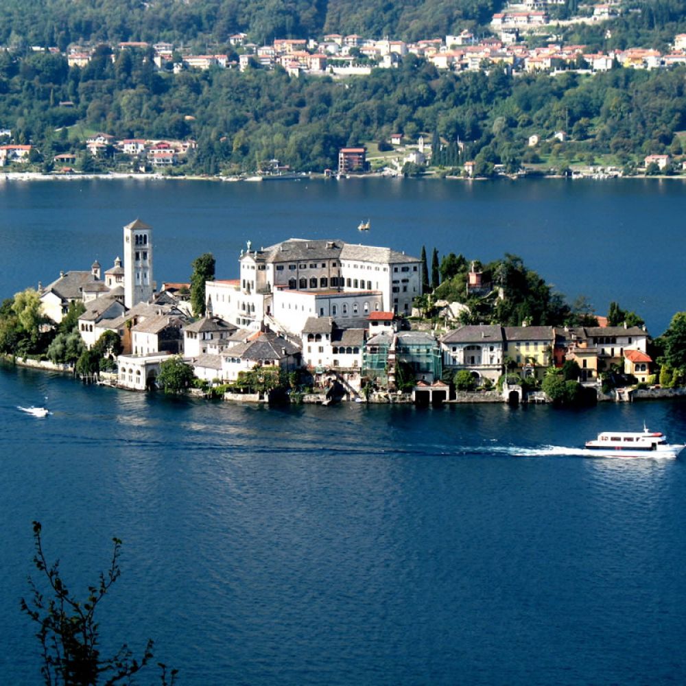 Panoramica dell’isola di San Giulio con battello per gruppi